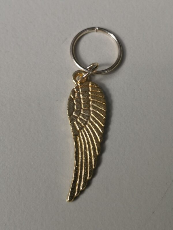 L’intero ciondolo è lungo 40mm, l’ala è lunga 27mm e larga 9mm, l’anello ha un diametro di 10mm. Tutto l’insieme è spesso 1mm e pesa meno di 1g.