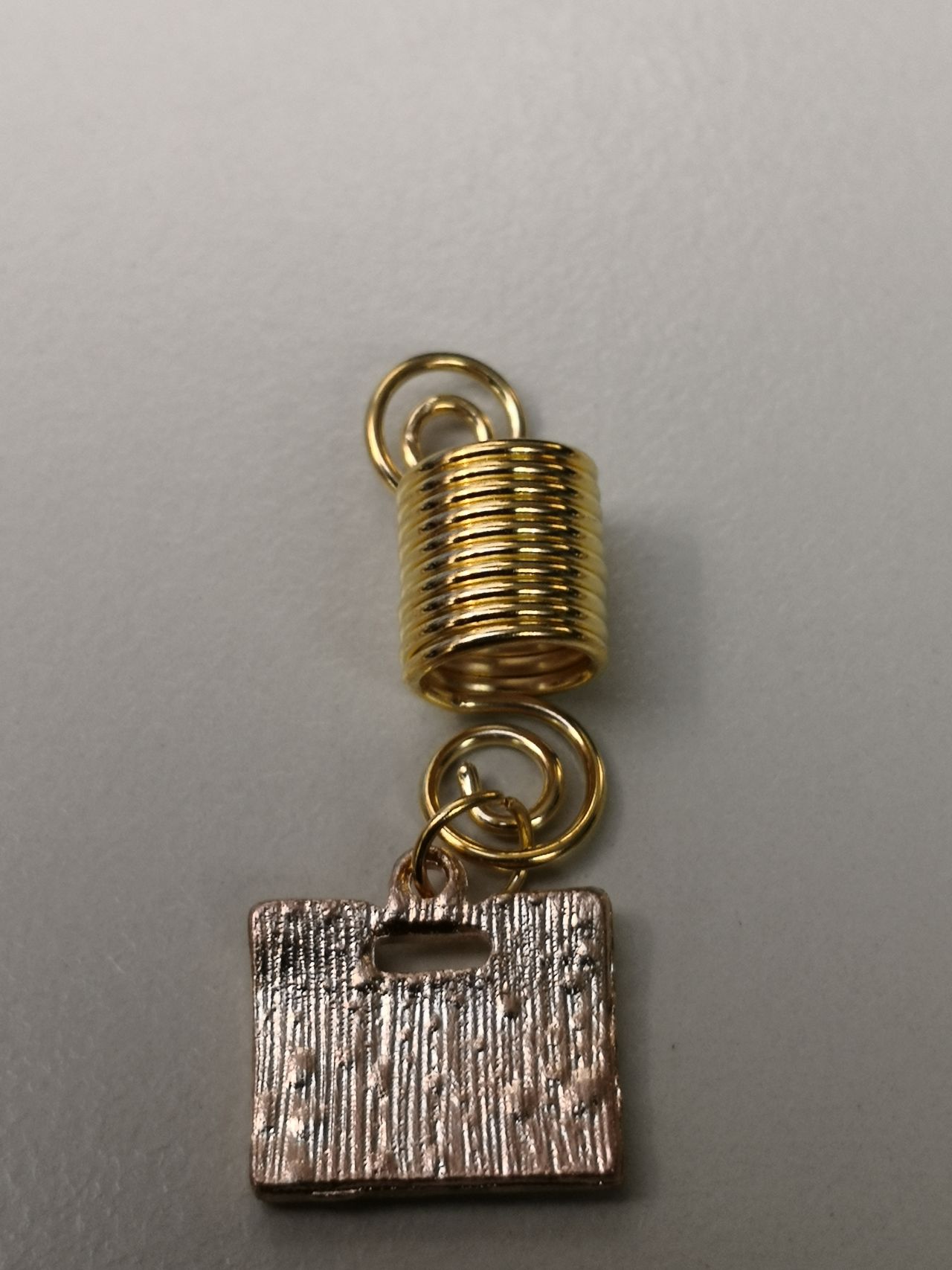 L’intero ciondolo è lungo 45mm, il quadrato misura 16x13mm, il twister è lungo 30mm e ha un foro di 8mm di diametro. Tutto l’insieme pesa 4g.